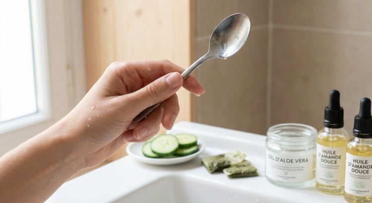 • Cuillères froides, thé vert, concombre, aloe vera et huile d’amande composent une routine express pensée comme des astuces naturelles contre les cernes du matin.