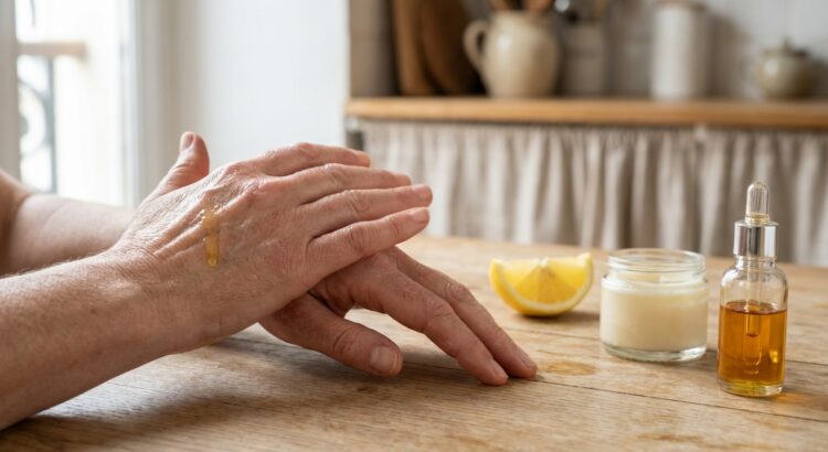 Une alternative simple se cache pourtant dans le placard de la cuisine. L’association d’une huile végétale et d’un peu de citron remplace déjà bien des tubes. Huile d’olive ou d’amande douce apportent vitamines et acides gras nourrissants, pendant que le citron, riche en antioxydants et en vitamine C, réveille l’éclat des mains fatiguées. Pour un soin express du soir, on mélange 1 cuillère à café (5 ml) d’huile d’olive ou d’amande douce avec 3 à 5 gouttes de jus de citron frais, et l’on garde une petite serviette en coton pour éponger l’excédent.