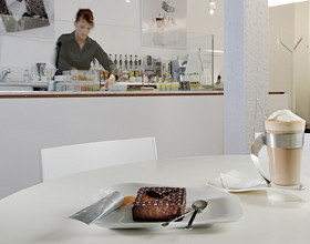 Un côté bar pour un chocolat en solo ou un coin lunch pour les goûter entre filles. Le chocolat chaud :Alors là, c’est le vrai paradis. Au total 19 saveurs classiques ou exotiques (6,50 euros la tasse). Celui-ci est préparé à partir de boules de ganache parfumé, et de lait chauffé au bain à 73deg4 précisément. Mes préférées : chocolat noir au gingembre frais ou chocolat blanc pistache. Miam !!!