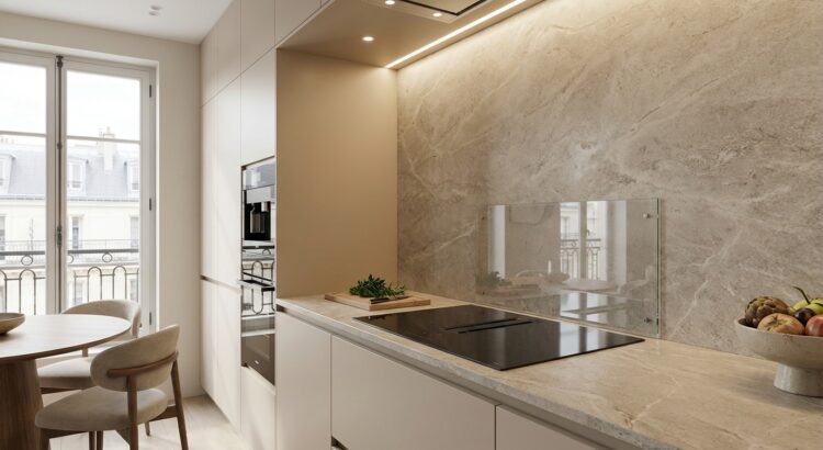 Dans les projets plus haut de gamme, la tendance est à la « crédence-bloc » : le plan de travail remonte sur le mur en une seule dalle de pierre naturelle, de quartz ou de grès cérame XXL. Veines douces de marbre, quartzites beiges, décors pierre frittée créent un effet monolithique très chic, sans rupture ni petite découpe de carreaux. Comptez environ 50 à 100 €/m² pour un grès cérame grand format, quand un microciment posé tourne autour de 100 à 180 €/m² et qu’un marbre naturel dépasse souvent 100 €/m².