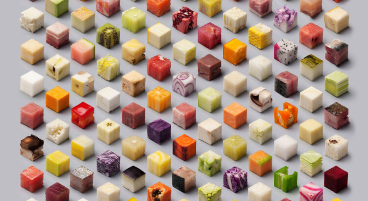 Première question : la nourriture prend tant de formes, laquelle choisir ? C’est ainsi que les deux artistes ont découpé 98 cubes de fruits, légumes, viandes et poissons, tous de dimension identique : 2,5 cm de côté. Chaque aliment a de ce fait la même importance que ses voisins. Chacun des cubes présente un aliment facile à trouver dans le commerce et sous sa forme crue.
