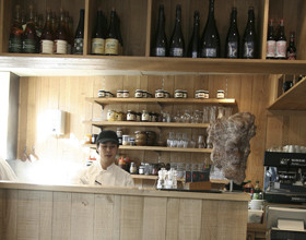 Loin des crêperies traditionnelles, le lieu est très minimaliste, avec une déco en bois brut, granit et des chaises hautes façon bar à sushis.