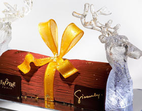 La bûche collector de noël, imaginée par le créateur de mode Hubert de Givenchy pour Lenôtre. Une véritable œuvre d’art, je vous le dis !! On se régale de ce biscuit moelleux au chocolat, orné de deux splendides têtes de cerf en sucre coulé, allié à un croustillant de fruits secs, d’un crémeux de chocolat noir, plus un parfait au chocolat au lait au thé Earl Grey. Inoubliable ! Parfait pour un réveillon au sommet des montagnes.