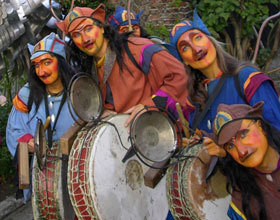 En descendant dans la rue, tout simplement ! Nous jouons partout en France et en Europe, été comme hiver. Au détour d’une rue, si vous apercevez un drôle de personnage masqué, monté sur échasse et jouant du tambour, ne fuyez pas !
