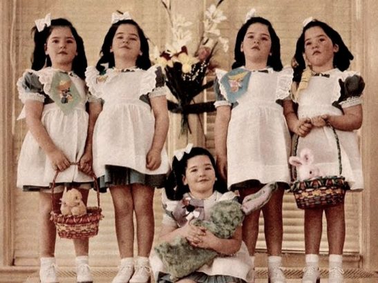 Nées au Canada le 28 mai 1934, Annette, Cécile, Emilie, Marie et Yvonne sont les premiers quintuplés à avoir vécu au-delà de la petite enfance. Une chance sur 57 millions que cela se produise ! Cela leur a valu une attention toute particulière, qui leur a plutôt porté préjudice. En effet, les grossesses multiples sont très surveillées et, plus les bébés sont nombreux, plus il semble miraculeux qu’ils naissent tous en bonne santé. Ce miracle a valu bien des drames aux quintuplées de la famille Dionne.