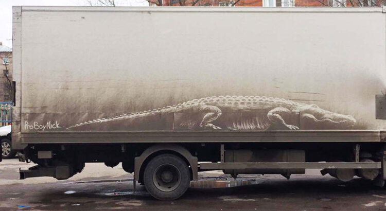 Nikita Golubev est un artiste russe né en 1981 qui combat la poussière à sa façon. Gorilles, requins, surfeurs, lions, poissons, fleurs… tout y passe. A l’aide de ses doigts ou de ses pinceaux, Nikita s’inspire de la suie noire qui recouvre des véhicules de Moscou pour tracer des motifs jubilatoires !