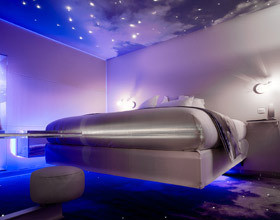 Les lampes sont en forme d’ailes d’ange. Tout comme le lit, les armoires sont suspendues, renforçant l’effet d’apesanteur. Une douche de pluie semble venir du ciel. La salle de bains, elle, bénéfice d’un ciel étoilé en fibre optique. L’apothéose !