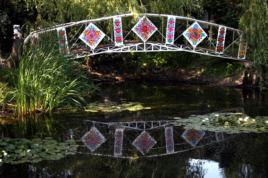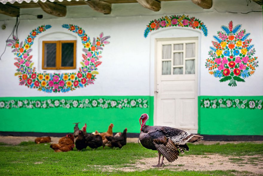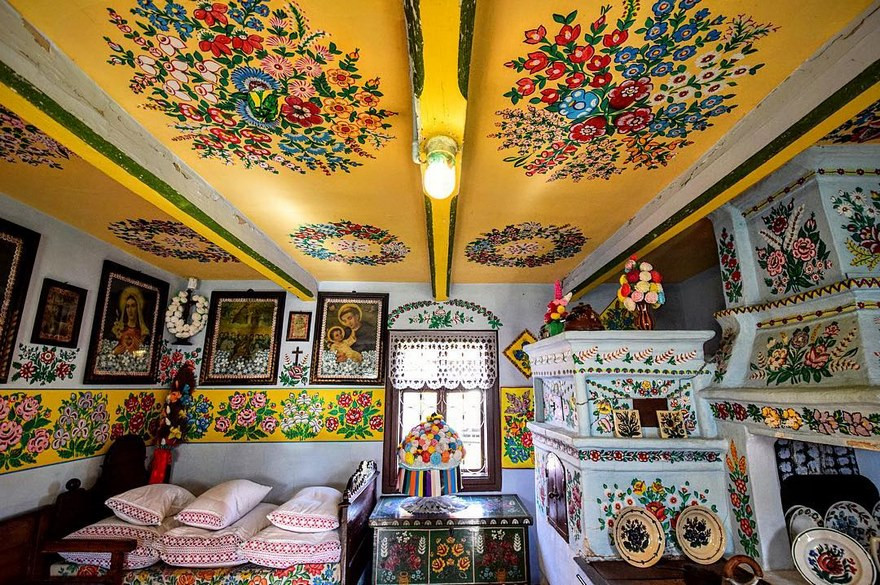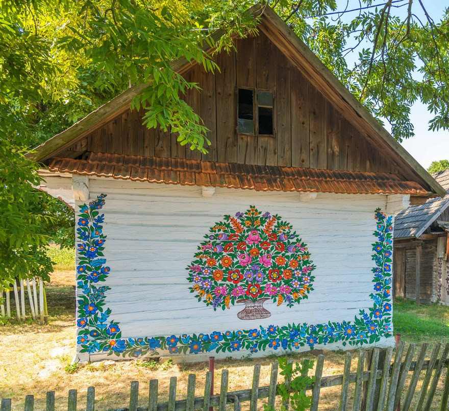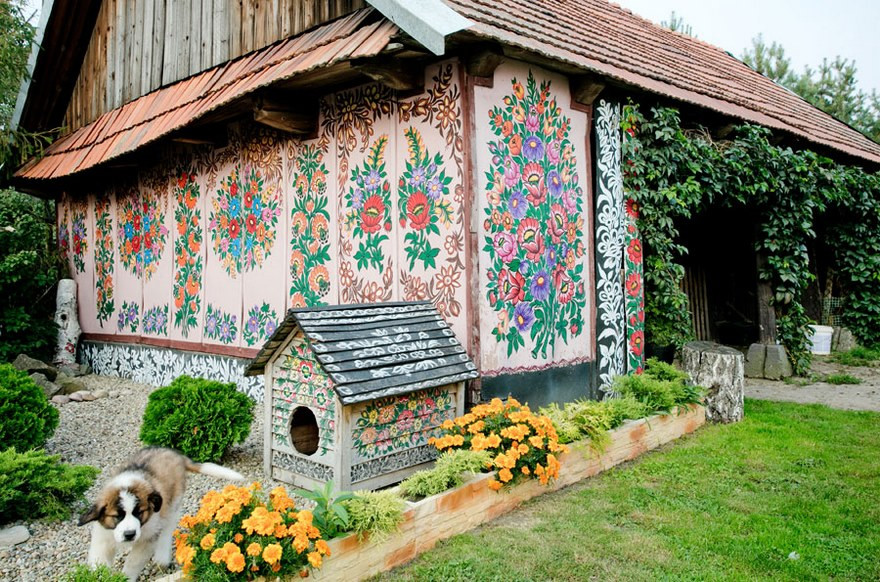 Les murs, les portes, les ponts, les puits, les niches des animaux, les objets des maisons… tout ce qui peut se peindre est recouvert de fleurs colorées et autres motifs végétaux. La légende raconte que les premiers dessins ont été réalisés par une femme qui voulait cacher les traces de suie de sa cheminée. Comme elle n’arrivait pas à blanchir à la chaux les contours, elle s’est dit qu’elle allait procéder autrement en rajoutant de la couleur. Elle fut rapidement imitée par ses voisines et c’est ainsi que les dessins entrèrent dans les maisons du village de Zalipie.