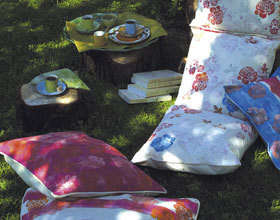 Le triple coussin 4/ Pliez votre tissu peint et sec en deux, endroit sur endroit et cousez sur toute la longueur. Placez la couture ensuite au milieu du dos puis cousez à nouveau un petit côté pour fermer la housse à une extrémité. Retournez. Faites une seconde couture à 1 cm du bord sur ce même côté pour obtenir une petite bande plate.Insérez un coussin.