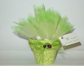 – Minis pots de fleurs diamètre 6cm- deux couleurs peinture acrylique- du gel ‘craqueleur’- des pinceaux- du sisal de la couleur du ‘fond’- des tulles- des dragées- du ruban- de quoi faire les étiquettes- une perforatrice- un pistolet à colle- un peu de patience- une décoration à appliquer sur le petit noeud du pot