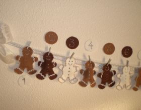 24 petits bonhommes de pain d'épice en feutrine avec chaque jour une surprise différente, chocolat, pièce...Les chiffres se mettent en bas du bonhomme...