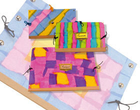 – 1 plaque de « carton-bois »- 4 à 5 feuilles de papier de soie aux teintes de votre choix- papiers de soie aux couleurs assorties- vernis-colle- 1 m de drisse marine (2 mm de diamètre)- kraft gommé- porte-étiquettes dorés ou métalliques – attaches parisiennes- coins métalliques ou dorés – clous à griffe- 1 pinceau- 1 cutter- 1 règle- 1 aiguille à tricoter