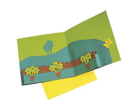 1/ Choisissez une carte double verte et les papiers de couleur correspondants pour composer les motifs découpés.2/ Utilisez une feuille de papier épais (270 g) vert foncé pour les volumes et le carton ondulé nature.