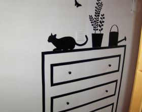 Vissez dans le mur les boutons de tiroirs pour faire un effet 3D. Vous pouvez décorer votre commode avec les accessoires que vous voulez. Il vous suffit de dessiner les silhouettes sur l’envers du rouleau d’adhésif noir, des les découper et de les coller en faisant bien attention de chasser les bulles d’air. Et c’est tout !