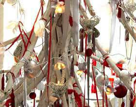 5/ Accrochez pompons et coquillages sur le sapin.