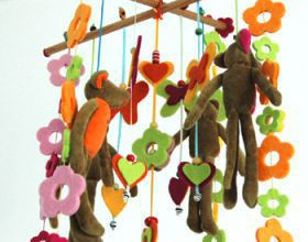 Sur des rubans ou des fils de couleur, enfilez, cousez ou collez vos éléments. Vous trouverez dans le commerce de nombreuses formes en feutrine de toutes les couleurs, mais vous pouvez aussi les faire vous même dans des coupons. A vous ensuite de les agrémenter de boutons, broderies, perles, grelots, … Ici, j’ai aussi ajouté des petits doudous.
