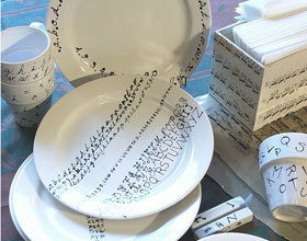 3/ Versez le contenu du godet dans l’applicateur de Gutta. Enlevez le capuchon et vissez la plume métal.4/ Une à une, décorez les assiettes en réalisant des exercices de calligraphie ou de graphisme. Faites des rangées de lettres sur le bord.