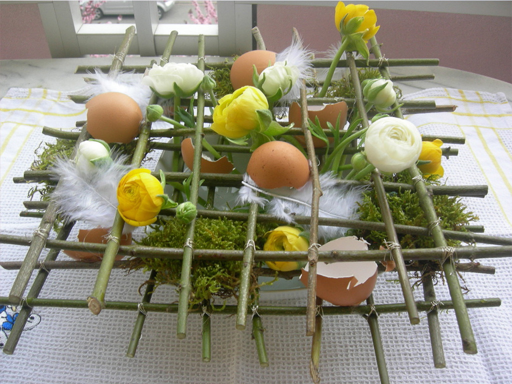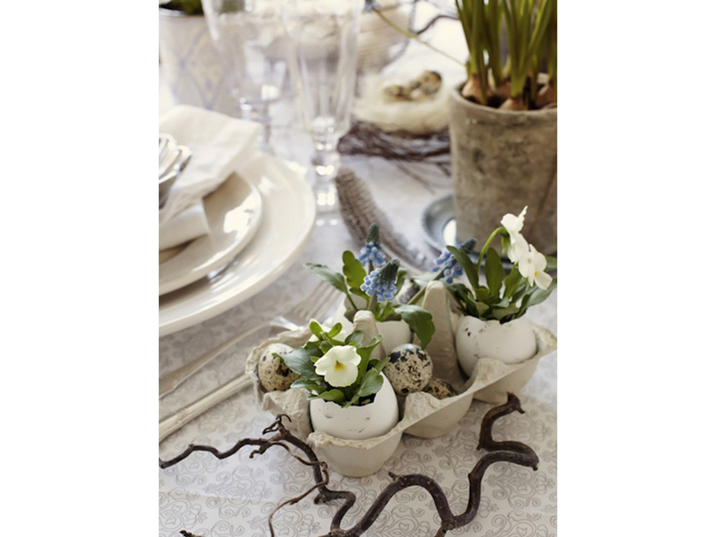 En plaçant des œufs, ou même de simples brisures de coquilles, dans une composition florale, on obtient une déco de table simple et gaie.