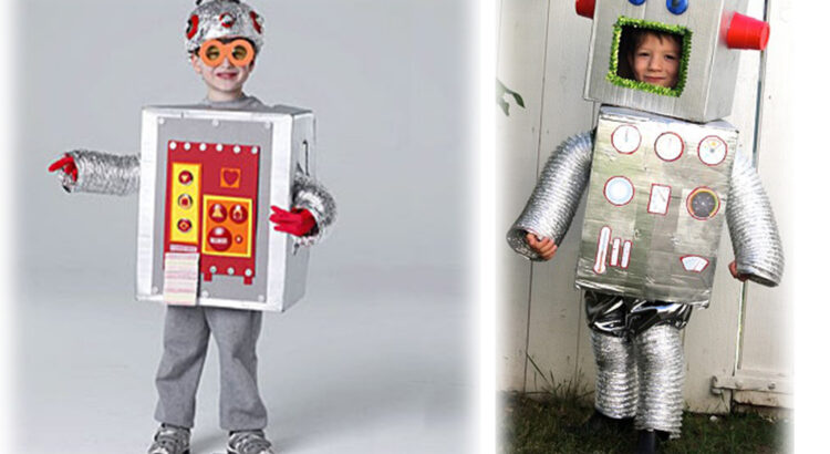 Dans le principe, c’est à nouveau un carton décoré qui sert de corps à ce petit robot. Ensuite laissez libre cours à votre imagination pour le customiser. Le carter du robot peut être équipé avec des boutons, en utilisant des bouchons de bouteilles, des vrais boutons de merceries, du carton… Avec des bouts de tuyau flexible, vous pouvez ajouter des bras, des jambes à ce robot. Et, pour parfaire l’effet métal machine,  pourquoi pas un casque tout alu ? A moins que vous ne préfériez une tête rigolote !