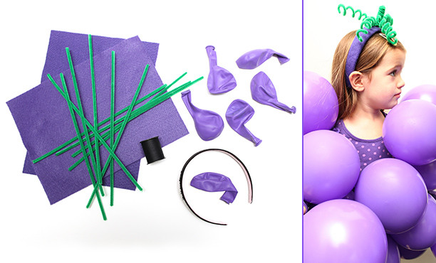 Avec des ballons de baudruche violets, verts ou rouges, vous pourrez constituer une jolie grappe de raisin en les fixant au scotch sur les vêtements de l’enfant. Il y a plusieurs manières de faire le feuillage. Ici le serre-tête est décoré de cure-pipe, mais on peut aussi y coller des ballons vert foncé plus petits. Pour un effet volume garanti !
