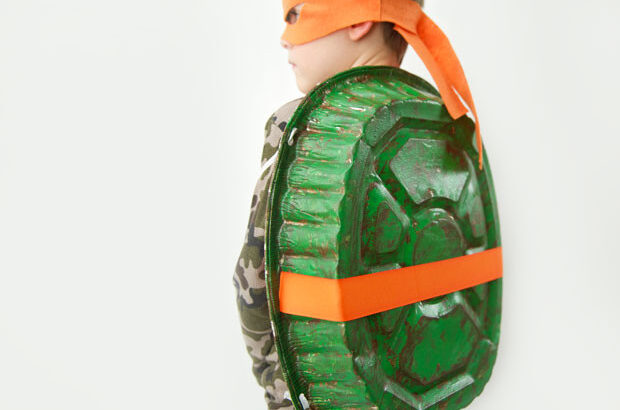 Quoi de plus simple que de préparer une carapace de tortue à l’aide d’un plat en alu ?  On marque les reliefs à la peinture, tout simplement. Pour les fans : un petit masque, une ceinture en papier et des abdos jaune vif, et voilà que ces petites bêtes deviennent des vrais Ninjas !