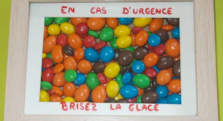 Voilà une idée qui semble tout à la fois simple, amusante et originale. Un cadre photo détourné de son usage initial va se trouver rempli de M&M’S colorés. Sur la vitre, on pourra mettre un message du type « A ne briser qu’en cas d’urgence » avec des feutres adaptés pour le verre (effaçables ou permanents, comme on préfère). Evidemment ce sera par le fond du cadre, fixé temporairement au scotch, que les gourmands iront s’approvisionner. Pas de casse et effet visuel garanti ! source