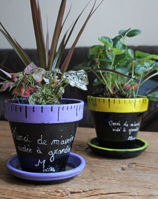 A Noël aussi, on offre des plantes ! C’est la saison des jacinthes odorantes ou des poinsettias flamboyants. Pour faire de cette plante un cadeau plus personnel, on customise un pot en terre banal. En le peignant de noir, on le transforme en tableau d’écolier, où on peut écrire un message qui dit merci ou quelques souhaits pour la nouvelle année toute proche. source