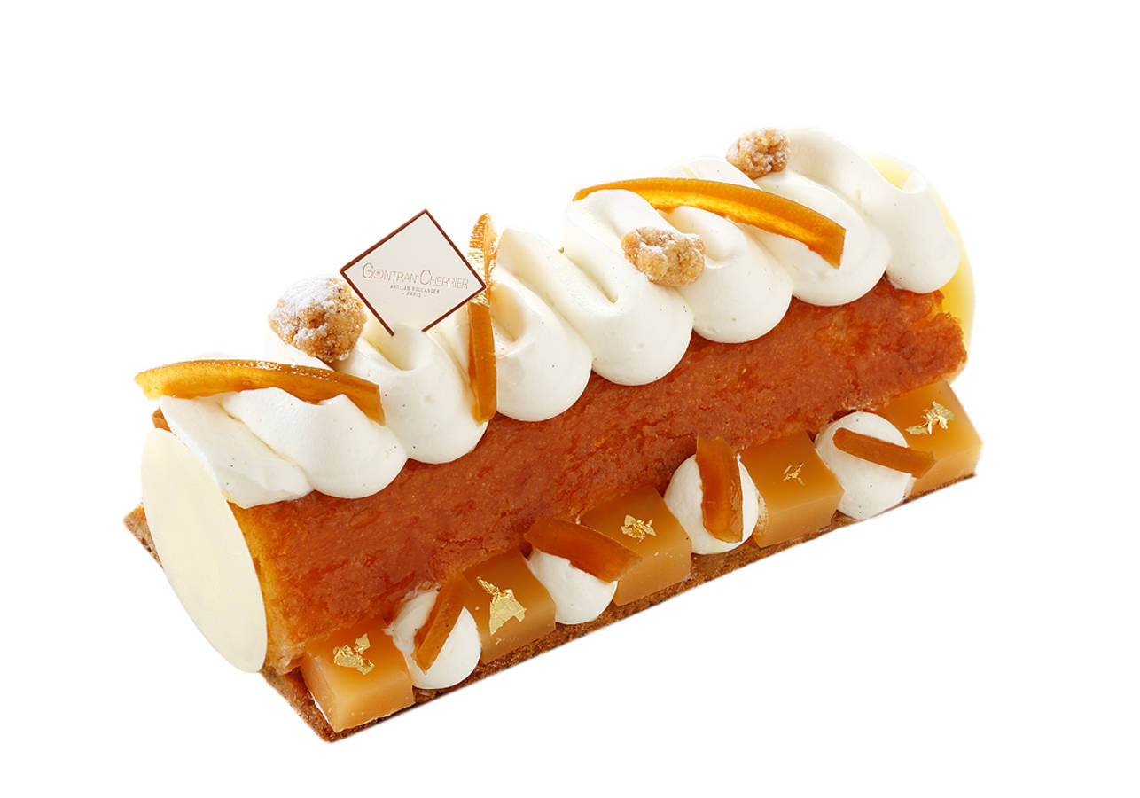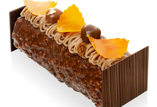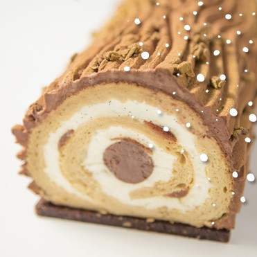 La bûche « Turino » de cet hiver comporte un biscuit léger fruit de la passion, une chantilly à la vanille, du confit de fruit de la passion et de la crème et des brisures de marron, le tout serti d’un glaçage de chocolat au lait et aux amandes. Vous pourrez la commander du 1