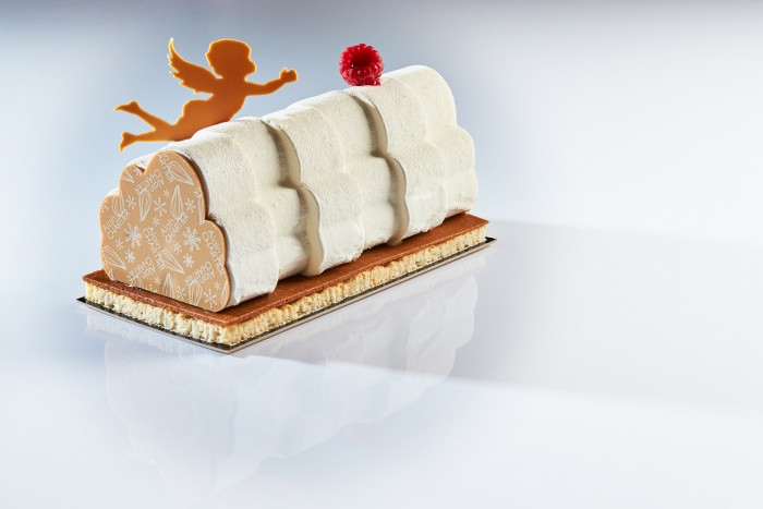 Voici une poétique bûche glacée très justement appelée « Cloud », remarquable pour son délicieux sorbet grenadine, associé à une crème glacée à la vanille et aux amandes caramélisées sur un croustillant de sablé breton. (24 € pour 4 personnes – 36 € pour 6 personnes – 44 € pour 8 personnes)