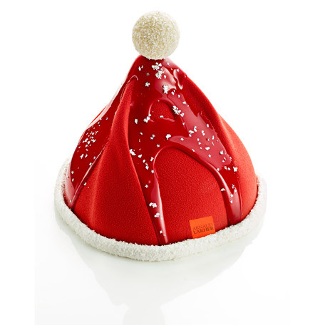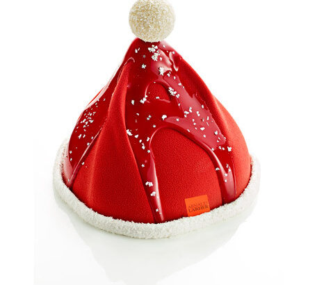 On quitte la traditionnelle forme de tronc d’arbre pour cette création du pâtissier Arnaud Larher. C’est un époustouflant bonnet de Noël qui vous est proposé, conjuguant la saveur de la framboise avec le parfum de la vanille. Un petit passage par le catalogue de la boutique vous permettra d’admirer un sapin de Noël en chocolat orné de fruits secs. Superbe ! (72 € pour 4/6 personnes)