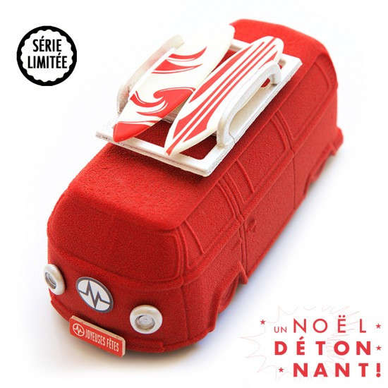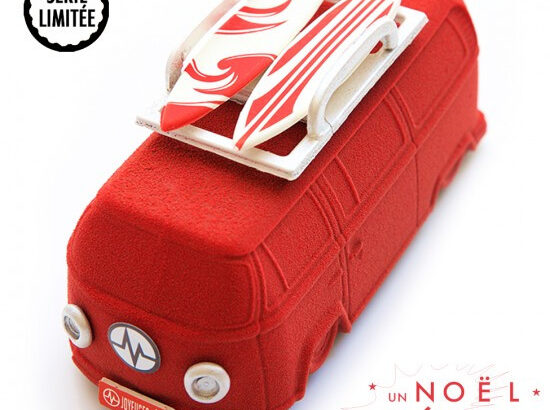 Modèle exclusif de cet hiver 2016, le van de Christophe Michalak est rutilant ! En vente à partir du 10 décembre 2016, cette bûche « Iconik » marie les saveurs d’un biscuit aux noix de pécan avec une mousse au sirop d’érable et un confit framboise-myrtille. On fond pour les planches de surf sur la galerie du combi, un détail craquant en chocolat au lait. (98 € pour 7/8 personnes)