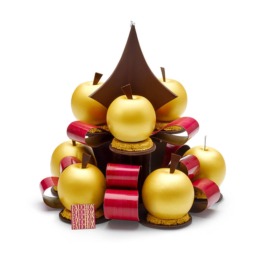 Pour les 130 ans de la maison Fauchon, le pâtissier Patrick Pailler a composé un arbre de Noël portant des pommes d’or. Chacun de ces fruits révèle des saveurs et textures multiples, allant du millefeuille de pommes au crémeux au sudachi (petit agrume japonais), en passant par une mousse de fromage blanc, un pain de Gênes aux épices et un crumble citron vert-cannelle. Tellement beau, et tellement bon ! (100 € pour 8 personnes)