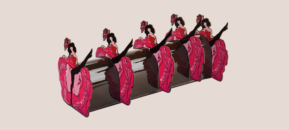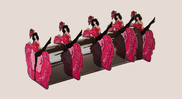 Elle est dansante, la bûche « Cancan » du chocolatier Jean-Paul Hévin ! Cinq danseuses de french cancan y lèvent la jambe pour une fête toute en chocolat, amandes et griottes. Elles seront en ligne du 6 au 22 décembre pour recevoir vos commandes. (42 € pour 7 personnes)