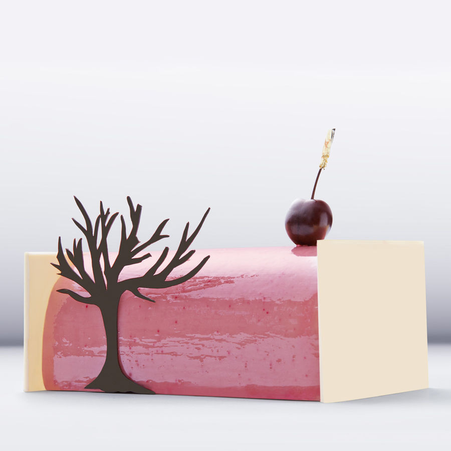 Inspiration asiatique chez le chocolatier Sébastien Bouillet pour cette bûche « Sakura » où on retrouvera tout naturellement une compotée de griottes et une mousse au thé noir. Pour les textures craquantes, on pourra compter sur un biscuit soufflé japonais à la pistache et un croustillant amande. (36 € pour 6 personnes)