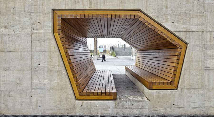 Dans ce site industriel désaffecté réaménagé, ce banc abrité allie béton et bois avec beaucoup d’élégance.