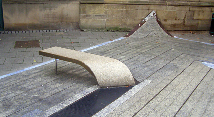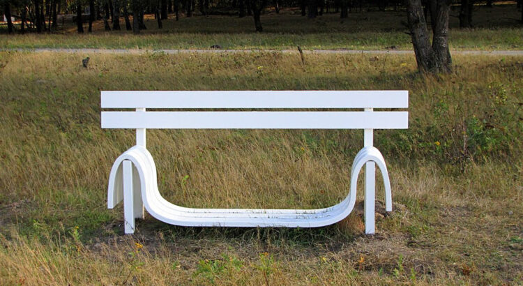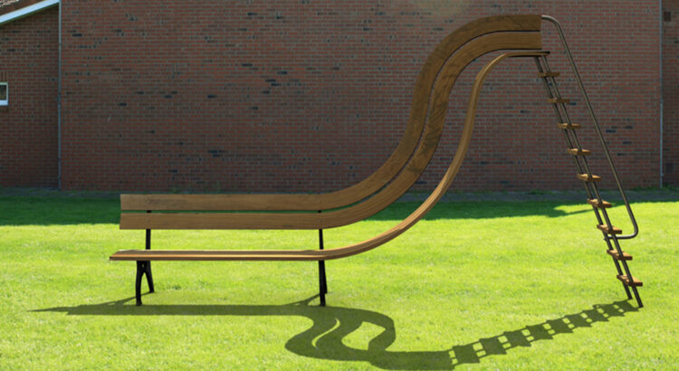 L’artiste allemand Robert Rickhoff n’hésite pas à apporter un peu de loufoque à l’environnement ordinaire en ajoutant des éléments absurdes. Ici il a créé un banc-toboggan qu’on imaginerait bien réel, mais qui, si on s’attarde un peu sur l’image, présente quelques dangers !