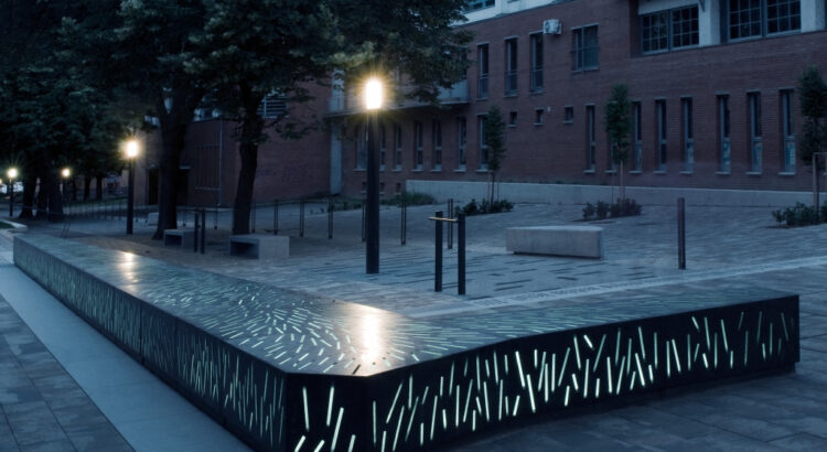 Bien qu’il soit entièrement en béton, ce banc comporte des incrustations de verre qui laissent passer l’éclairage nocturne.