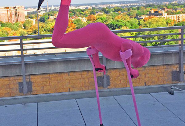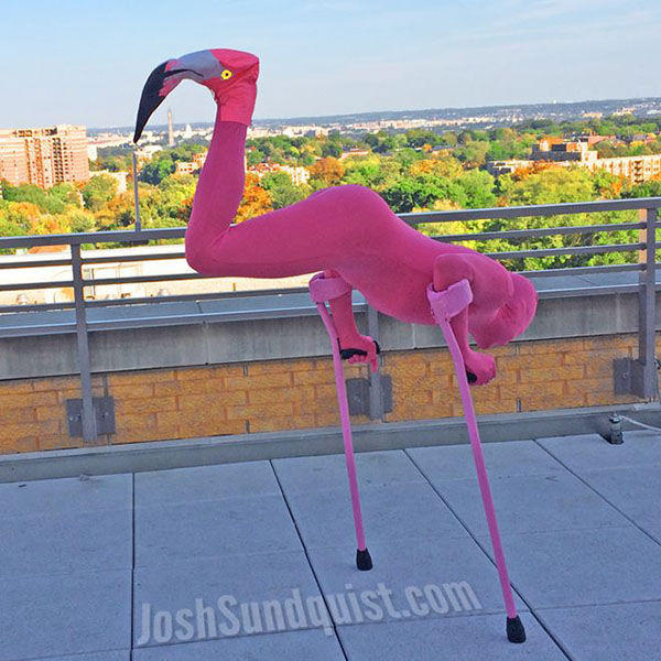 En 2013, Josh Sundquist se lance carrément un défi de gymnaste en se déguisant en flamant rose. C'est lors d'une promenade au zoo qu'il fait le lien entre lui et ces animaux. Et faut reconnaître que son costume est carrément bluffant ! Pas très pratique... mais excellentissime.