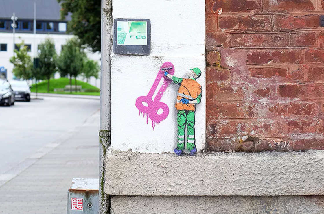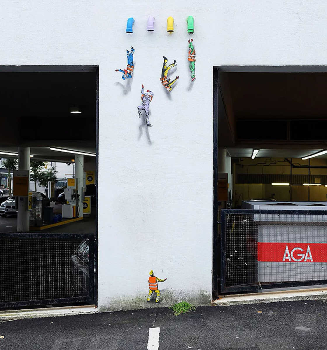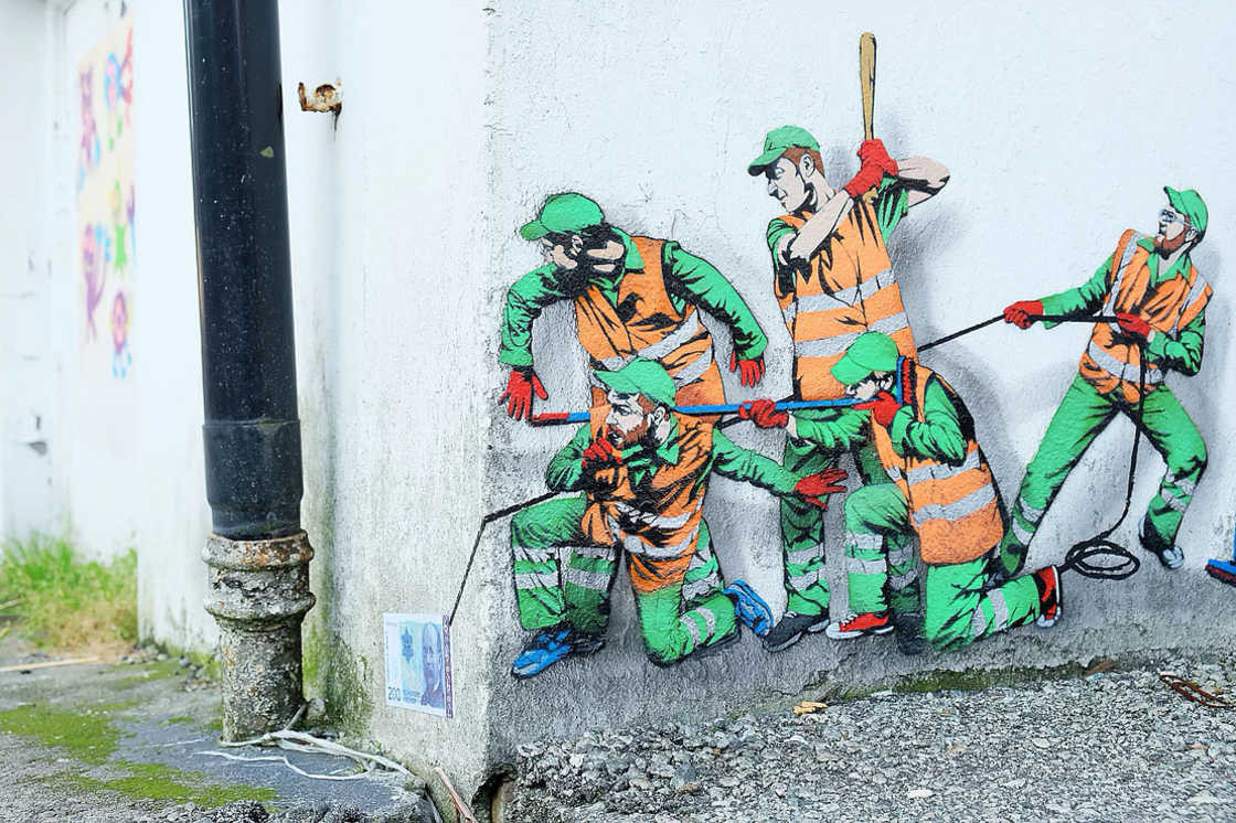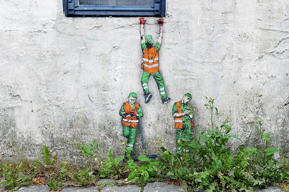 Le street-artiste Jaune (Jonathan Pauwels  de son vrai nom) a choisi sa cible. Avec autant de tendresse que d’humour, il joue avec le quotidien fantasque des employés de la DDE, les agents des services techniques qui gèrent l’entretien de nos villes. Penchez-vous car son travail est de petite taille et il place ses scénettes discrètement.