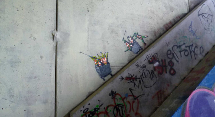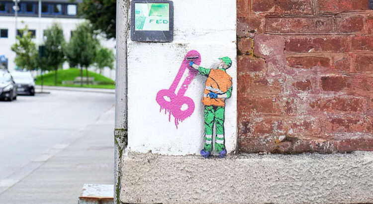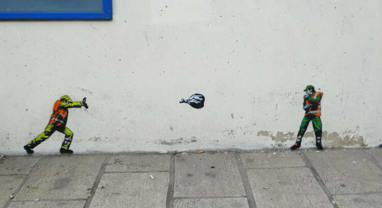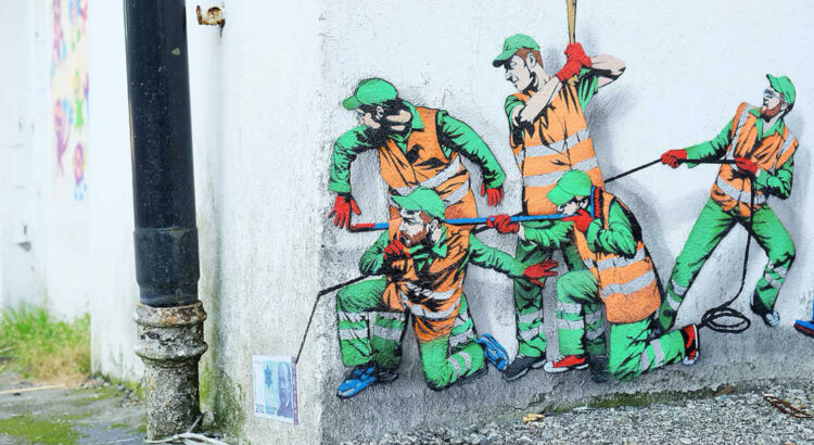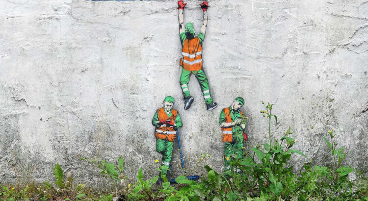 Le street-artiste Jaune (Jonathan Pauwels de son vrai nom) a choisi sa cible. Avec autant de tendresse que d’humour, il joue avec le quotidien fantasque des employés de la DDE, les agents des services techniques qui gèrent l’entretien de nos villes. Penchez-vous car son travail est de petite taille et il place ses scénettes discrètement.