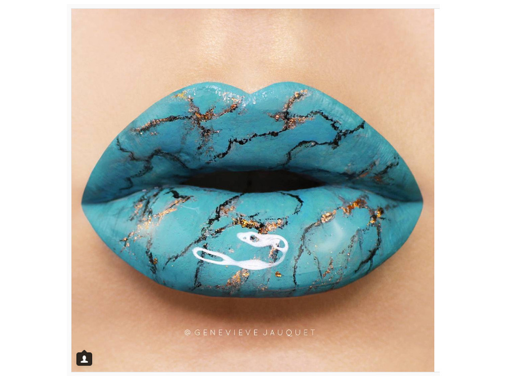 On trouve toutes sortes d’inspirations dans la galerie de l’Australienne Genevieve Jauquet : texture, couleur, dessin, bijou... Et ce maquillage qui imite la pierre de turquoise est fascinant !