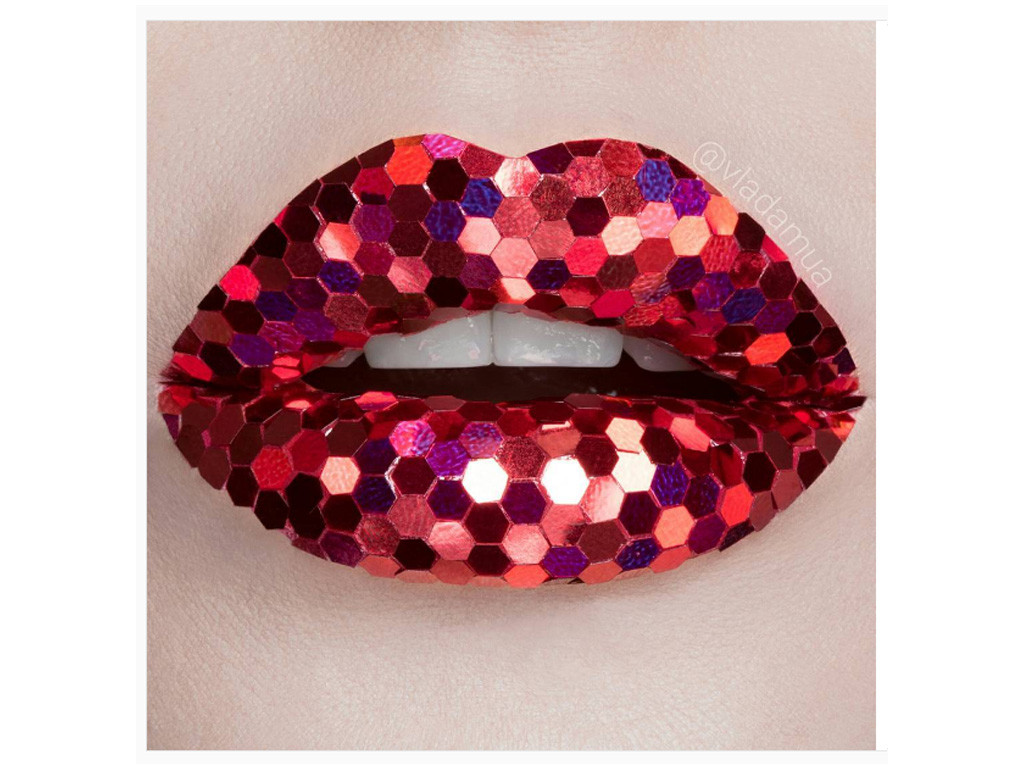 L’artiste Vlada Haggerty peint les lèvres de ses modèles de décors colorés, mais ces derniers temps elle expérimente le métal et ses reflets. La bouche devient bijou, comme sur cette photo ambiance rouge éclatant.