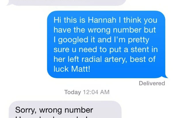 - Bonjour, c'est Hannah. Je pense que vous vous êtes trompé de numéro, mais je suis allée sur Google et je suis presque certaine que vous devez mettre un stent sur son artère radiaire gauche.