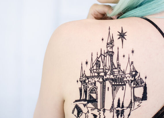 Tatouage spécial princesse de conte de fées... Un magnifique château à coller sur son épaule ou au creux des reins. Nul ne dit si le tatouage est livré par le prince charmant...