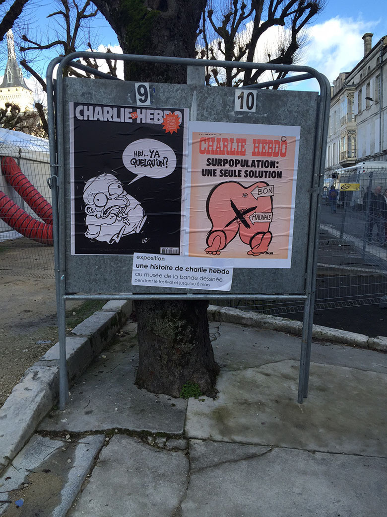 La ville d'Angoulême a ressorti ses panneaux électoraux pour offrir aux festivaliers les meilleures Unes de Charlie.