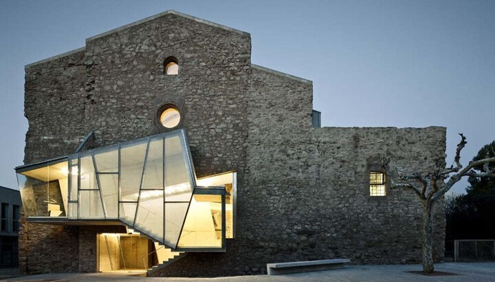 Dans le petit village de Santpedor, en Espagne, les architectes ont transformé la petite église locale du XVIIIème siècle en un lieu dédié à la culture. La construction d’origine était partiellement en ruine avant l’intervention. Le projet a fait le choix de consolider ce qui restait de l’église et de lui ajouter de nouvelles parties en matériaux totalement différents, comme cette grande verrière que montre la photo. Le résultat donne une construction d’allure très contemporaine.