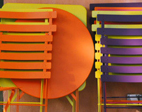Je lutte contre la grisaille avec du mobilier flashy : je conserve mes petits sièges fuchsia, j’ajoute une petite table vert anis et je craque pour des pots éclatants, comme ici sur ce balcon meublé par Fermob.