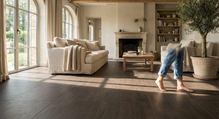 A première vue, on dirait un sol d’ardoise posé dans un loft : grandes dalles mates, reliefs subtils, joints réguliers. Puis l’on marche pieds nus, et surprise, la surface reste tiède, presque moelleuse. Beaucoup de Français cherchent ce compromis entre cachet minéral et confort du bois, surtout dans les pièces où l’on vit vraiment.