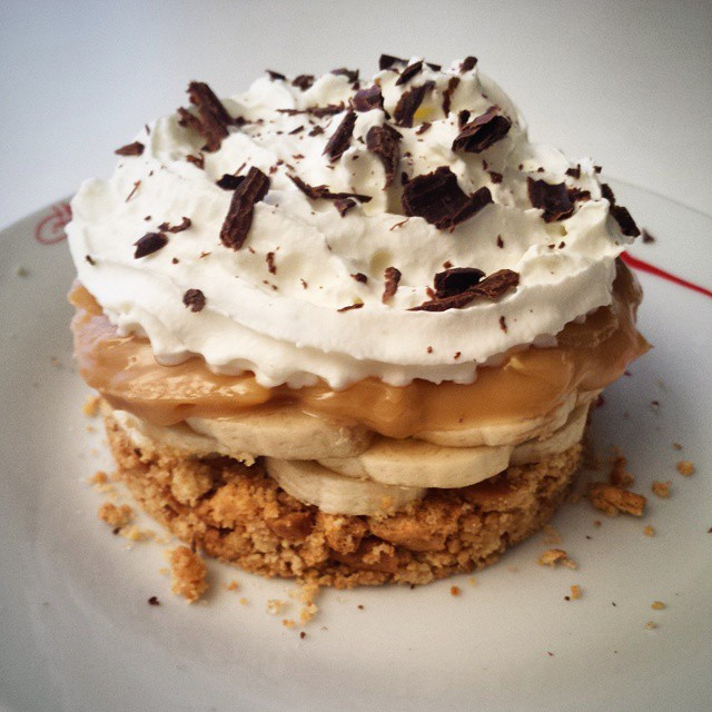 Le banoffe, contraction de banana et toffee est LE dessert tendance aux US. Un savant mélange de biscuits sablés anglais, de caramel toffee et de bananes bien sûr.