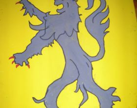 reproduire le blason, le peindre et faire le contour au feutre noir, le vernir. ensuite au dos mettre les poignees de portes pour tenir le bouclier.